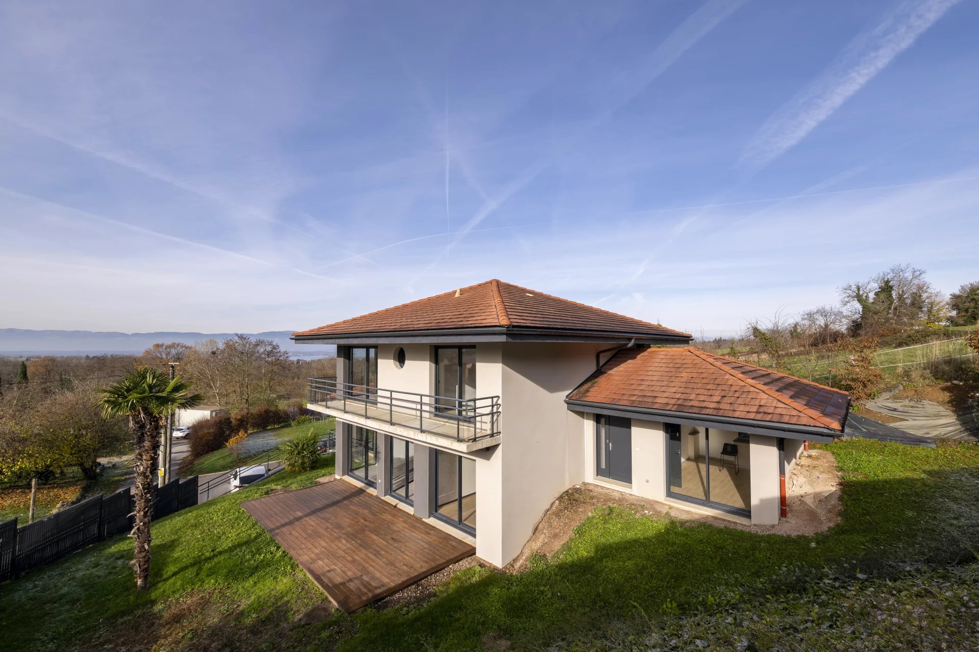 On the first floor, the villa features a fully-equipped open-plan kitchen, opening onto a living room on the lower half-level. Thanks to its large bay windows, you can enjoy unobstructed views over the fields and Lake Geneva, with triple exposure to east, north and west. The dining room, an extension of the kitchen, opens onto a wooden terrace and the garden. This level also includes an entrance hall with cupboard, a separate toilet with washbasin, and a bedroom with its own private shower room. A laundry room with water point, located on the south-facing side of the house, can be converted to suit your needs.