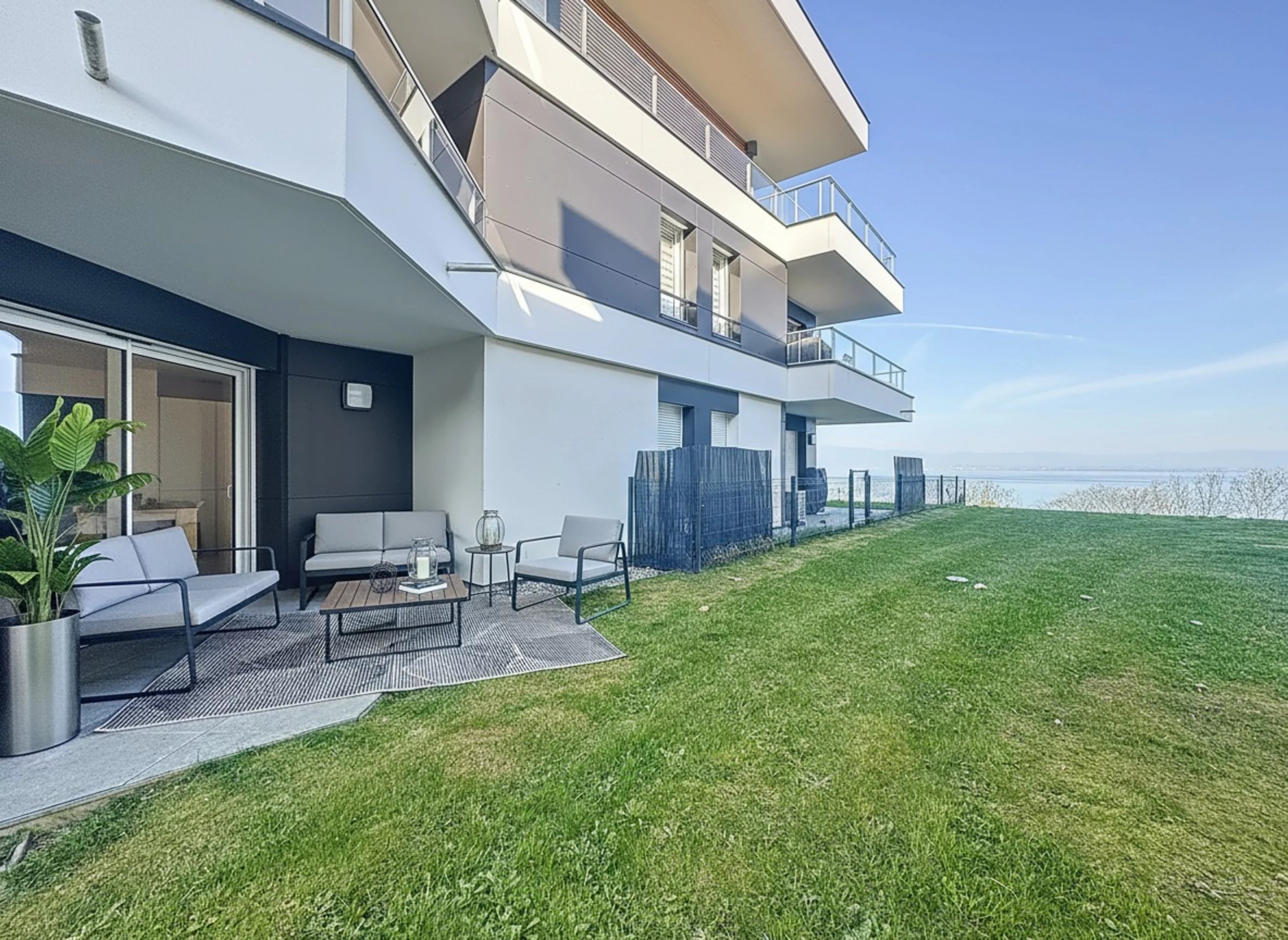 Venez découvrir cet appartement de 50 m² situé dans la charmante commune de Neuvecelle, à la limite d'Évian. Dès l'entrée, vous serez séduit par la spacieuse et lumineuse pièce de vie ouverte, intégrant une cuisine moderne, entièrement aménagée et équipée. Le salon s'ouvre sur une terrasse couverte et le jardin, créant ainsi une continuité parfaite avec l’extérieur, tout en offrant une vue imprenable sur le lac. Sans vis-à-vis direct, cet appartement offre un cadre de vie intime et paisible.